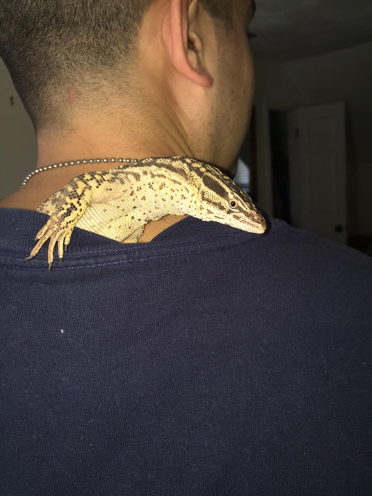 Suddenly, my phone produced an unusual sound, a tornado warning. I have lived through many a tornado warning with barely an uptick of wind speed, so I didn’t think much and went about my business. My business at this point was to feed my Australian Spiny-Tailed Monitor lizard (aka Ackies Monitor) aptly named Drake for his propensity to explore. I grabbed a few superworms and dropped them into a bowl. Occasionally I will hand feed him a worm or two and this night was one of those occasions. Usually I am pretty careful but as I was about to give him the superworm, I heard my two-year-old call “Daddy!” I looked away, the worm slipped from my grasp and was sitting on my middle finger, and my monitor lizard clamped down. Poor Drake! I don’t think he liked the taste of my blood. He soon realized that I wasn’t food and tried to pull away but his teeth were stuck in my middle finger. I knew I had to react quickly and calmly so he didn’t rip any of his teeth out in the process. It’s highly unlikely that he would unless I tried to rip him off of me. I didn’t; instead I slowly eased him forward and slipped his teeth from under my skin and he went on eating away, assuring me that he wasn’t injured or traumatized by the incident.