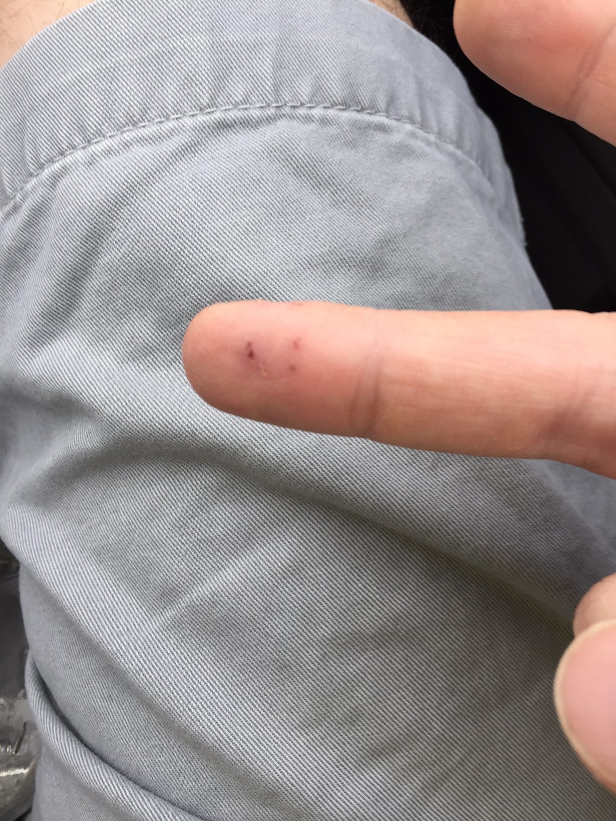 My mother was a little worried about infection from Drake’s bite so we grabbed some 91% isopropyl alcohol. I scrubbed a little…the blood would not wipe off. I scrubbed some more, nothing. I scrubbed and scrubbed and scrubbed…still there. I then tried warm water and soap to no avail. Finally, I gave up. The consensus among my family was that the blood was under the epidermis, kind of like a blood blister. A few minutes later, one of the oddest storms I have ever been in (outside of my time on a 295’ Barque) came blowing in with sustained gales and gusts that reached upwards of 70 mph. Just like that, my family and I piled into a central bedroom in the house and waited. I couldn’t help but look out the window occasionally, and at one point I saw the football that had been trapped in our tree since we bought the house dislodge and fly across our back yard. At some point during the storm, I found myself mindlessly sucking on my wounded finger. Naturally I pulled it out of my mouth to examine it; the blood was now starting to come off. I sucked some more, and then some more, and it was gone.
